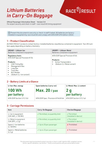 Present this document to security or check-in staff if asked. All batteries are factory-installed in equipment by race result AG and comply with IATA DGR 67th Edition (2026).
