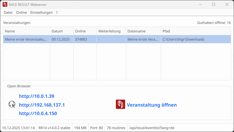 Wenn Sie offline arbeiten, müssen Sie zuerst RACE RESULT 14 herunterladen und installieren. Öffnen Sie anschließend den RACE RESULT Web Server und checken Sie Ihre Veranstaltung aus.