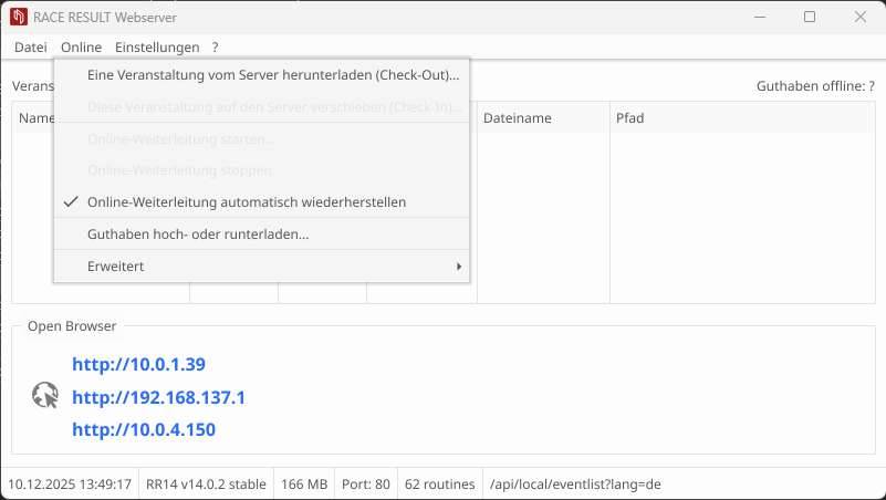 Der RACE RESULT Webserver wird verwendet, um eine Veranstaltungsdatei lokal auf Ihrem Rechner zu öffnen. Zudem können Sie im Webserver neue Dateien erstellen, wenn Sie komplett offline arbeiten möchten.
