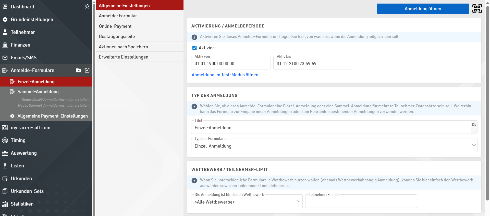 Standardmäßig wird für beide Typen jeweils ein Anmelde-Formular erstellt. Sie können allerdings nach Bedarf eine Vielzahl verschiedener Anmelde-Formulare erstellen. Aktivieren Sie zunächst ein Anmelde-Formular und geben Sie an, in welchem Zeitraum dieses aktiv sein soll.