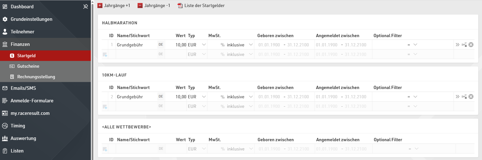 Sollen unterschiedliche Startgelder für unterschiedliche Altersgruppen gelten, geben Sie unter "Geboren zwischen" jeweils den Bereich des Geburtsdatums der Teilnehmer an.