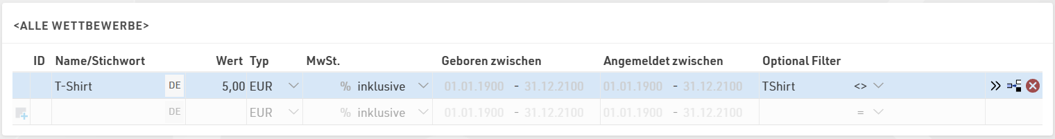 Um zusätzliche Startgelder hinzuzufügen, müssen Sie lediglich einen Namen und einen Wert definieren. Die Startgelder werden dann automatisch auf alle Teilnehmer angewendet, alternativ können Sie zusätzliche Filter für einzelne Startgelder definieren, wenn dieses Startgeld nur auf bestimmte Teilnehmergruppen zutrifft.
