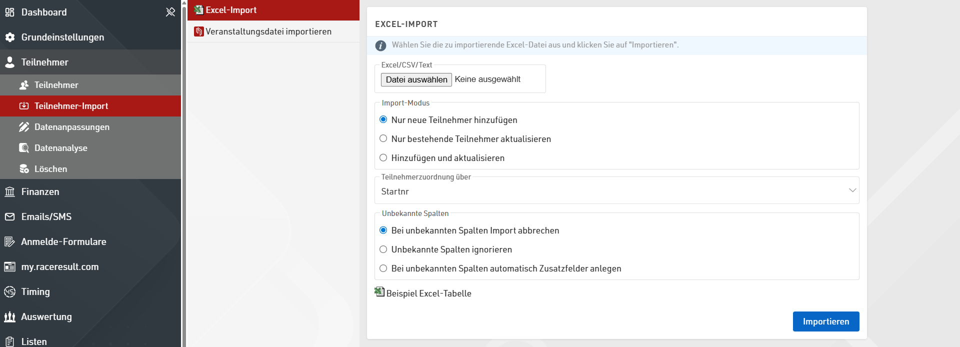 Nachdem Sie die zu importierende Datei ausgewählt haben, entscheiden Sie, ob Sie ausschließlich neue Teilnehmer hinzufügen, ausschließlich bestehende Datensätze aktualisieren oder beides möchten. Wenn Sie Datensätze aktualisieren müssen Sie angeben, auf welcher Basis Teilnehmer identifiziert werden. Standardmäßig erfolgt das gemäß der Startnummern, kann aber auch anhand der ersten vier Spalten erfolgen. Definieren Sie zuletzt noch, was mit unbekannten Spalten passieren soll. Entweder wird der gesamte Import abgebrochen, unbekannte Spalten ignoriert oder diese als neue Zusatzfelder mit der Spaltenüberschrift als Name angelegt.