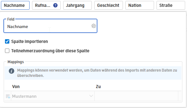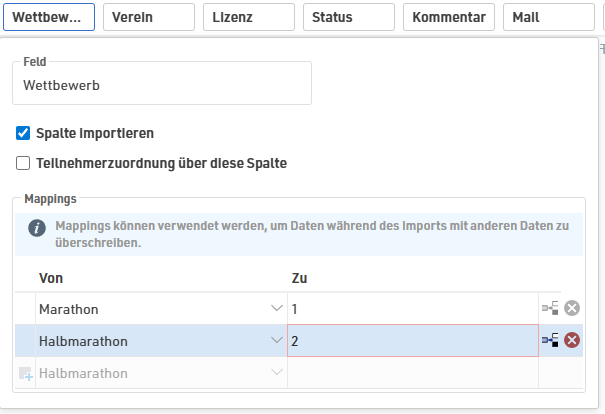 Über Mappings können Sie zudem eine Zuordnung von Feldern aus dem Import zu Werten in der Veranstaltungsdatei definieren. Dies ist empfehlenswert, wenn das Format der Import-Datei nicht mit dem Format in RACE RESULT 14 übereinstimmt. Oftmals ist dies der Fall bei der Umwandlung von Wettbewerbsnamen zu Wettbewerbs-ID oder bei der Interpretation des Geschlechts (Männlich -> m, Weiblich -> f).