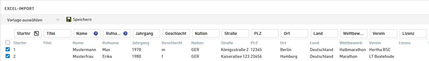 - Die erste Zeile enthält Spaltenüberschriften. Diese bestimmen, in welches Feld die Werte der Spalte standardmäßig importiert werden sollen. Diese Zuordnung kann in der Import-Vorschau überschrieben werden.