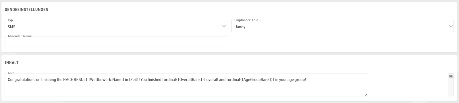 Wichtig: Der Versand von SMS ist nicht kostenlos! Sie müssen vor dem Versand Ihre Login-Daten angeben. RACE RESULT berechnet je versendeter SMS ein Credit.