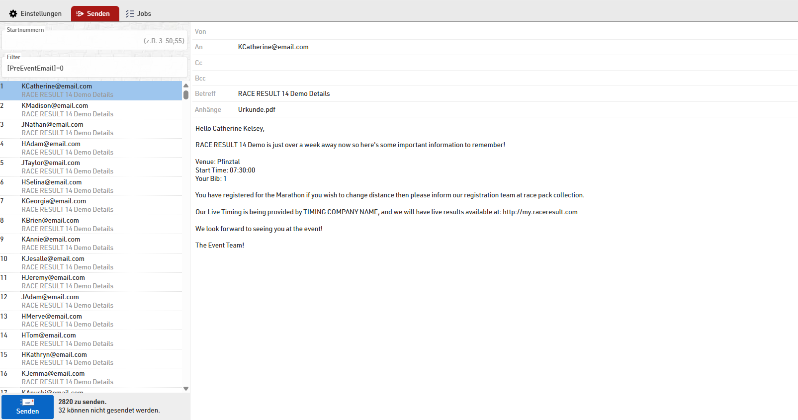 Wenn Sie Ihren SMTP-Server zum ersten Mal konfigurieren, testen Sie den Versand über den Server, indem Sie sich selbst eine E-Mail über RACE RESULT 14 senden.