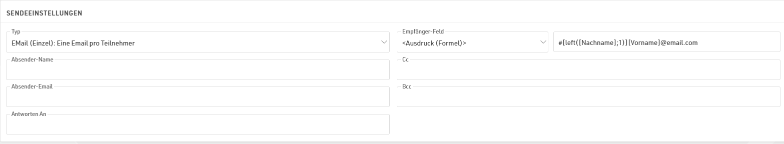 Wählen Sie das Empfänger-Feld (Standard: Email) aus, das die Email-Adresse(n) enthält, an die Emails gesendet werden sollen. Es ist ebenfalls möglch einen Ausdruck zu hinterlegen.