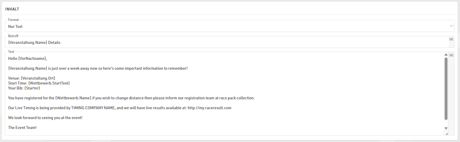 Email Vorlagen sind mehrsprachig, somit kann eine Vorlage den Inhalt mehrerer Sprachen beinhalten. Wenn eine Email über RACE RESULT 14versendet wird, wird das Standard-Feld Sprache genutzt, um die Email in der richtigen Sprache zu versenden. Ist bei einem Teilnehmer das Feld leer, oder für die hinterlegte Sprache keine entsprechende Vorlage vorhanden, wird die Email in der Sprache verschickt in welcher die Software aktuell genutzt wird.