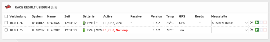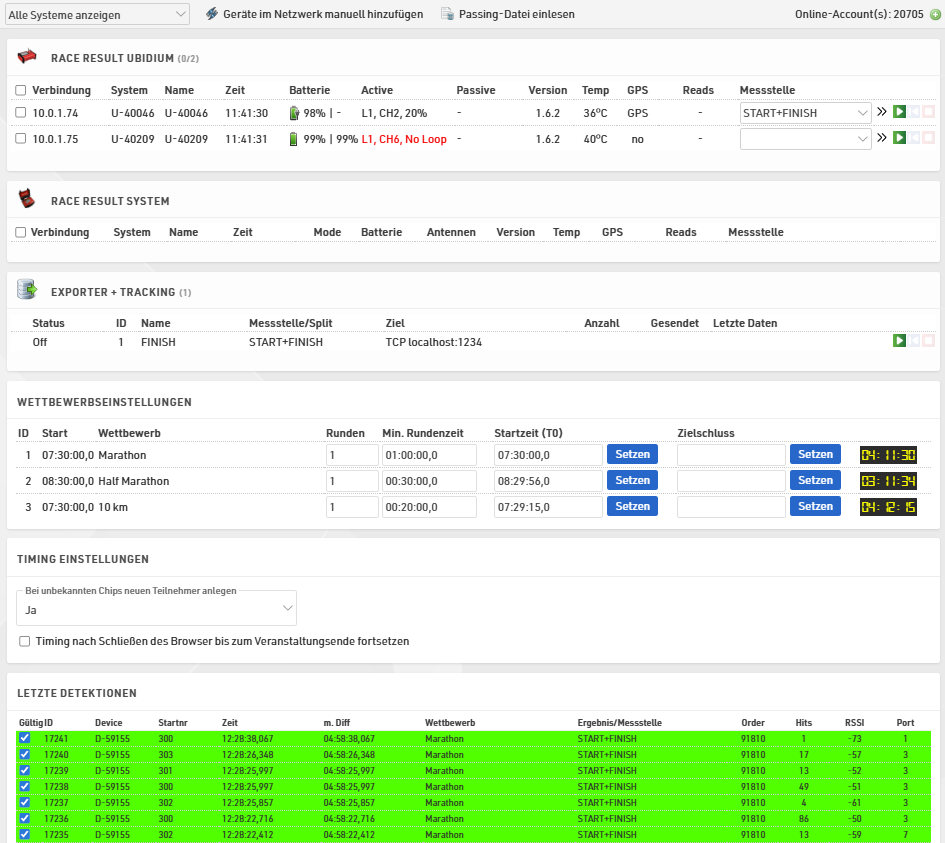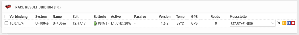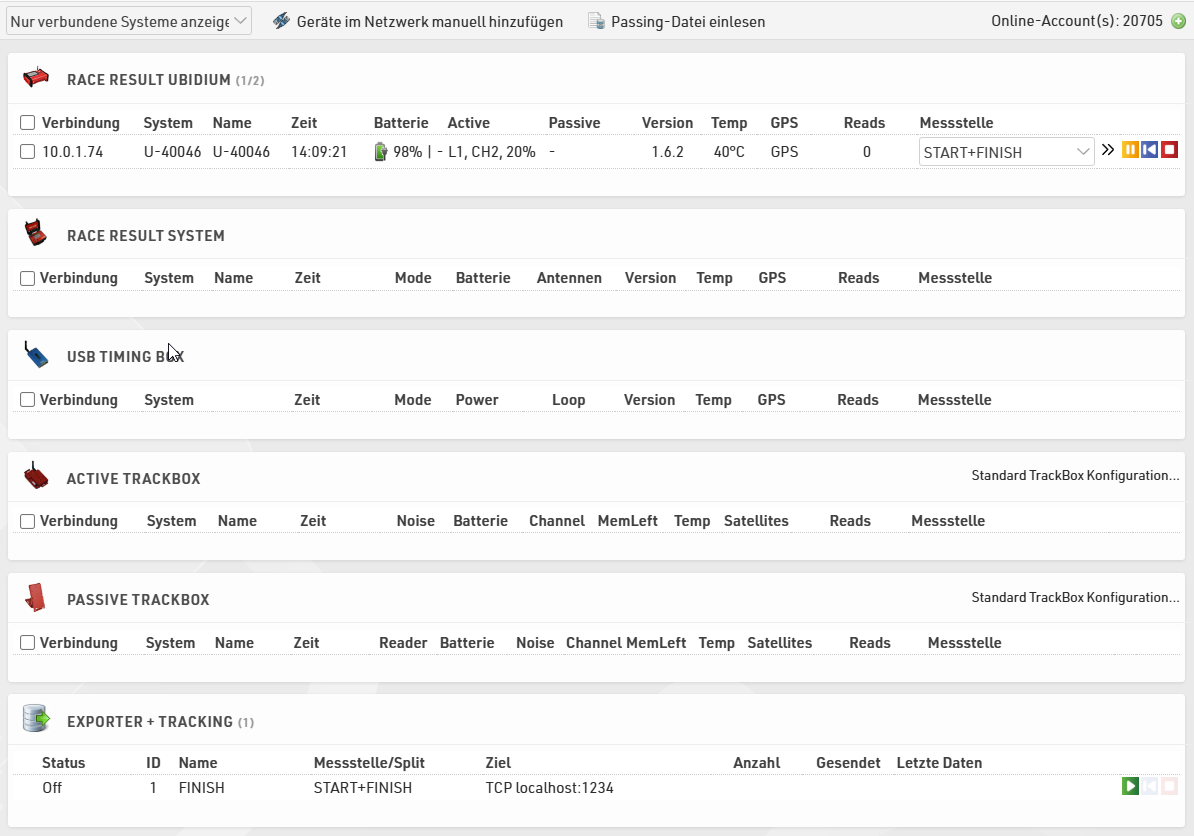Hier können Sie die Verbindung zu all Ihren RACE RESULT Systemen wie Ubidium, RACE RESULT Dekoder, USB Timing Box und Track Box herstellen und diese überwachen.