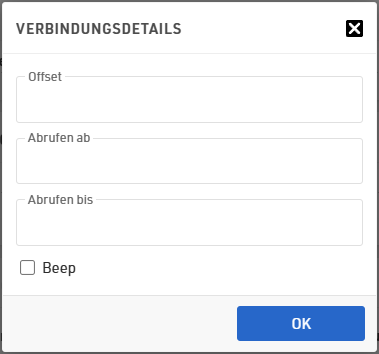 Durch die Angabe in Abrufen ab und Abrufen bis kann ein Zeitfenster angegeben werden in dem die auftretenden Detektionen akzeptiert werden. Diese Daten sollten im Format DD:hh:mm:ss.kkk angegeben werden. Dies wird of verwendet um Daten nur aus einem bestimmten Zeitraum im Nachgang einzuspielen.