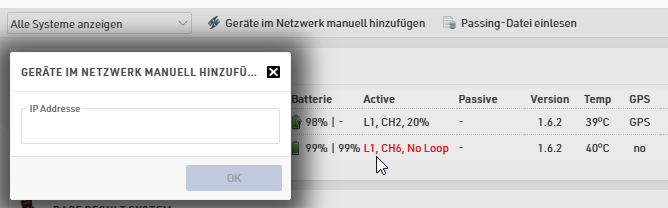 Wird ein lokal verbundenes System nicht angezeigt, kann über Geräte im Netzwerk manuell hinzufügen ein System über die Eingabe dessen IP Adresse mit der Software verbunden werden.