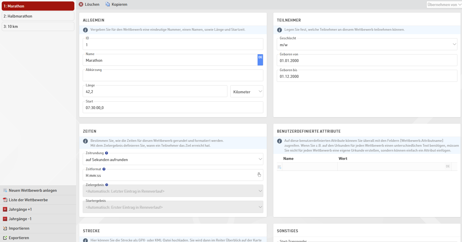 Jedem Teilnehmer wird ein Wettbewerb zugewiesen. Haben Sie bei Ihrer Veranstaltung z.B. einen Marathon, Halbmarathon und einen 10km-Lauf, richten Sie entsprechend drei Wettbewerbe ein und weisen die Teilnehmer dem gewünschten Wettbewerb zu. Auch wenn Ihre Veranstaltung nur aus einem Wettbewerb besteht, richten Sie einen Wettbewerb ein.