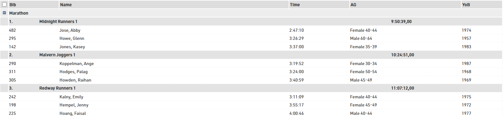 In manchen Fällen möchten Sie Spalten innerhalb der Gruppenüberschrift erstellen, z.B. bei Mannschaftswertungen. Im Beispiel erstellen wir eine Gruppierung mit der Platzierung, dem Teamnamen und der Gesamtzeit. Darunter wird jeder Teilnehmer einzeln aufgeführt.