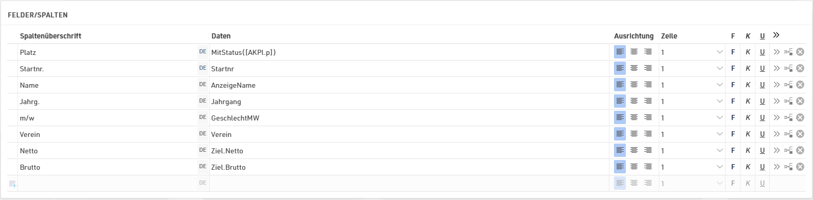 Über die Ausrichtung entscheiden Sie, ob die Spalten linksbündig, zentriert oder rechtsbündig dargestellt werden sollen. Zudem können Sie einzelne Spalten über B, I und U fett/kursiv/unterstrichen anzeigen.