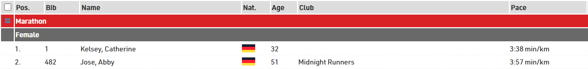 Diese Liste ist gruppiert nach Wettbewerb, Geschlecht und Altersklasse: