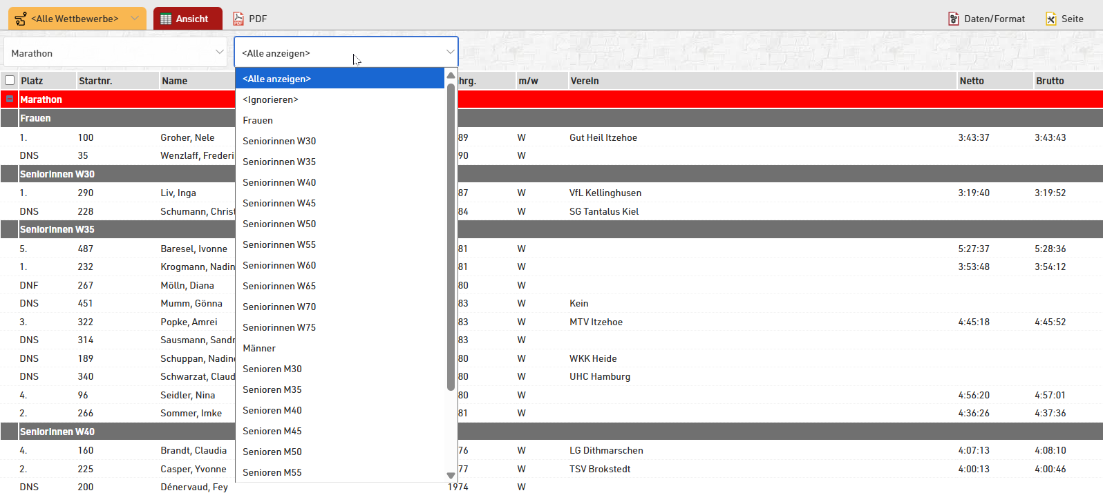Die Gruppierungsvariablen können auch als Filter angewendet werden. In diesem Fall können Sie über ein Drop-Down-Menü einen einzelnen Gruppierungswert auswählen und nach diesem filtern. Setzen Sie beispielsweise die Altersklasse als Filter, werden standardmäßig alle Altersklassen angezeigt, Sie können aber über ein Drop-Down eine einzelne Altersklasse auswählen und nur diese anzeigen lassen. Diese Filter funktionieren analog in veröffentlichten Ergebnislisten auf my.raceresult.com.