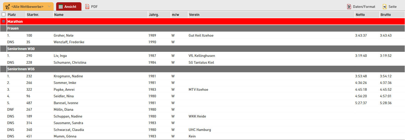 Unterschiedliche Spaltenbreiten je Zeile können Sie nur in PDF-Listen erzeugen. Hierüber können Sie eine Ergebnisliste, wie im folgenden Screenshot, generieren, bei der die Rundenzeiten in der zweiten und dritten Zeile unterschiedliche Positionen haben als die Teilnehmerdaten darüber.