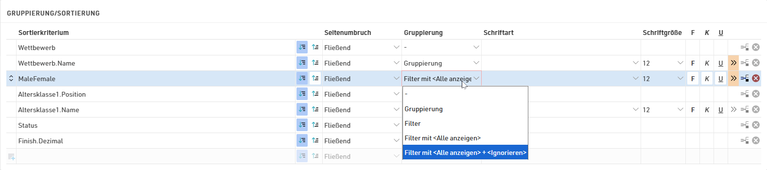Der Filter mit Ignorieren bewirkt dasselbe wie der normale Filter. Allerdings kann diese Gruppierungsvariable auch ignoriert werden. In obigem Beispiel könnten Sie z.B. die Altersklasse ignorieren und somit ganz einfach alle Teilnehmer eines Wettbewerbs untereinander anzeigen. Beachten Sie, dass beim Setzen des Ignorierens auch sämtliche Gruppierungen/Sortierungen unterhalb des Filters ignoriert werden.