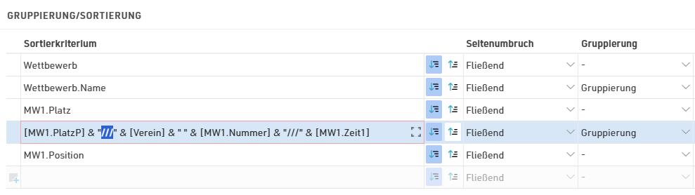- Neue Seite: wenn sich der Wert der Sortierung/Gruppierung ändert, wird eine neue Seite beschrieben. Eine Liste könnte z.B. eine neue Seite für jeden weiteren Wettbewerb füllen.