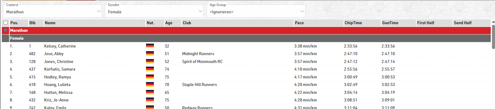 Darüberhinaus können Felder als Gruppierung oder als Filter verwendet werden. Wenn Sie die Gruppierung aktivieren, wird in allen Ausgabetypen eine Überschrift mit dem Inhalt des Feldes eingefügt. Sie können zusätzlich die Schriftart der Überschrift nach Ihren Wünschen anpassen. Alternativ können Sie den Filter aktivieren. Der Filter hat die gleiche Wirking wie die Gruppierung, zusätzlich wird aber ein Dropdown in der Ausgabe und auf my.raceresult.com eingeblendet, um auch einzelne Gruppen aufrufen zu können. Beim Filter mit Ignorieren können alle darunterliegenden Gruppierungsfilter ignoriert werden. Die Filter-Optionen sind besonders hilfreich für eine einfache Navigation auf my.raceresult.com.