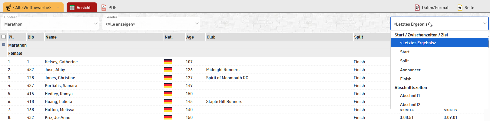 Wenn Sie mit dem Rennverlauf arbeiten, können Sie in Ergebnislisten eine Drop-Down Auswahl für Zwischenzeiten aktivieren, indem Sie einen der 3 folgenden Feldernamen in Ihrer Ausgabeliste verwenden. Anschließend können Sie in der Ergebnisansicht zwischen einzelnen Zwischenzeiten/Abschnitten wählen.