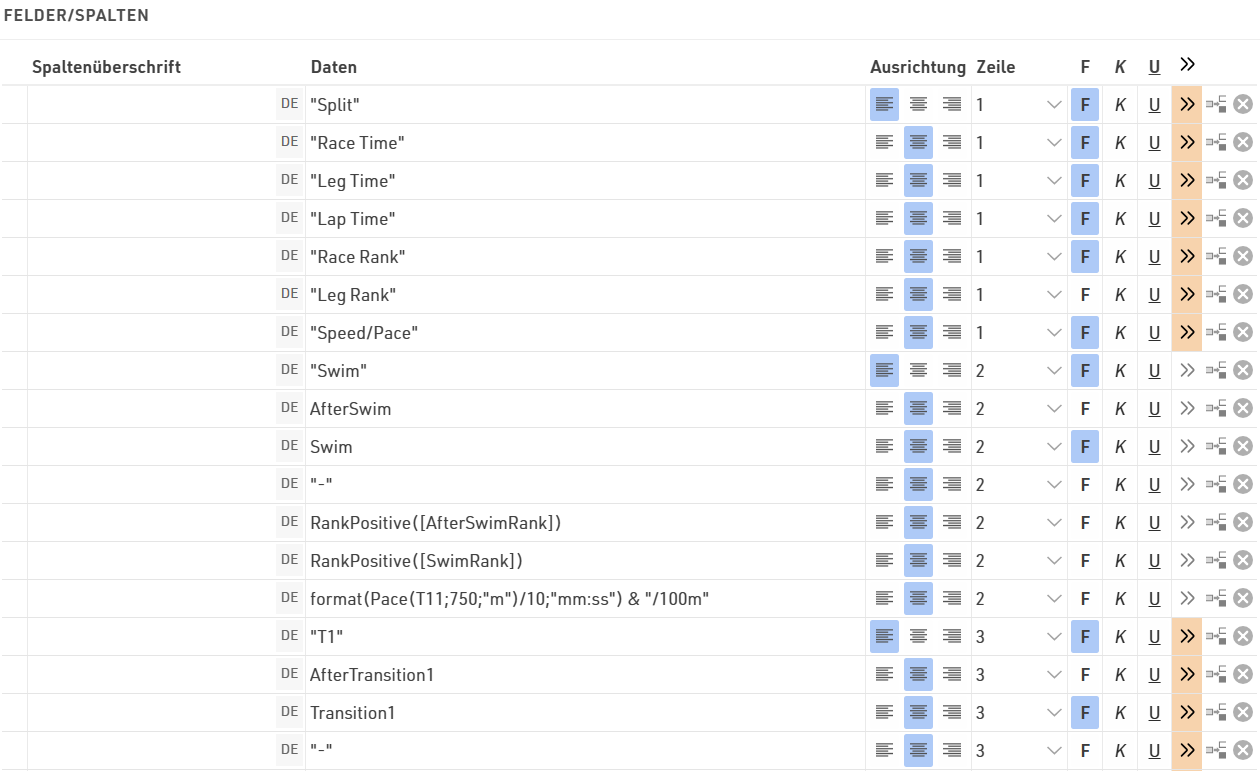 Mehrzeilige Listen sind eine einfache Möglichkeit, mehr Informationen auf einer Liste anzuzeigen. Für einen Datensatz (=Teilnehmer) können bis zu 50 Zeilen angelegt werden. Wählen Sie einfach eine Zeile größer als 1 für ein Feld/Spalte in Ihrer Liste. Mehrzeilige Listen werden häufig in Detail-Listen eingesetzt, um bspw. mehrere Zwischenzeiten anzuzeigen.