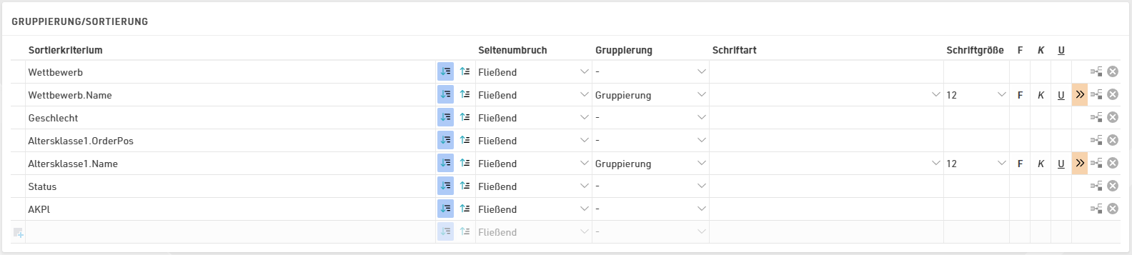 Eine Liste soll oft nach einem Feld gruppiert, aber nicht sortiert werden. In diesem Fall geben Sie das entsprechende Sortierfeld vor der Gruppierung an. In untenstehendem Beispiel wird die Liste nach der Wettbewerbs-ID sortiert, aber die Gruppenüberschrift ist der Wettbewerbname. Genauso wird innerhalb eines Wettbewerbs nach der Altersklassen-Position sortiert, aber die Altersklasse als Gruppenüberschrift verwendet.