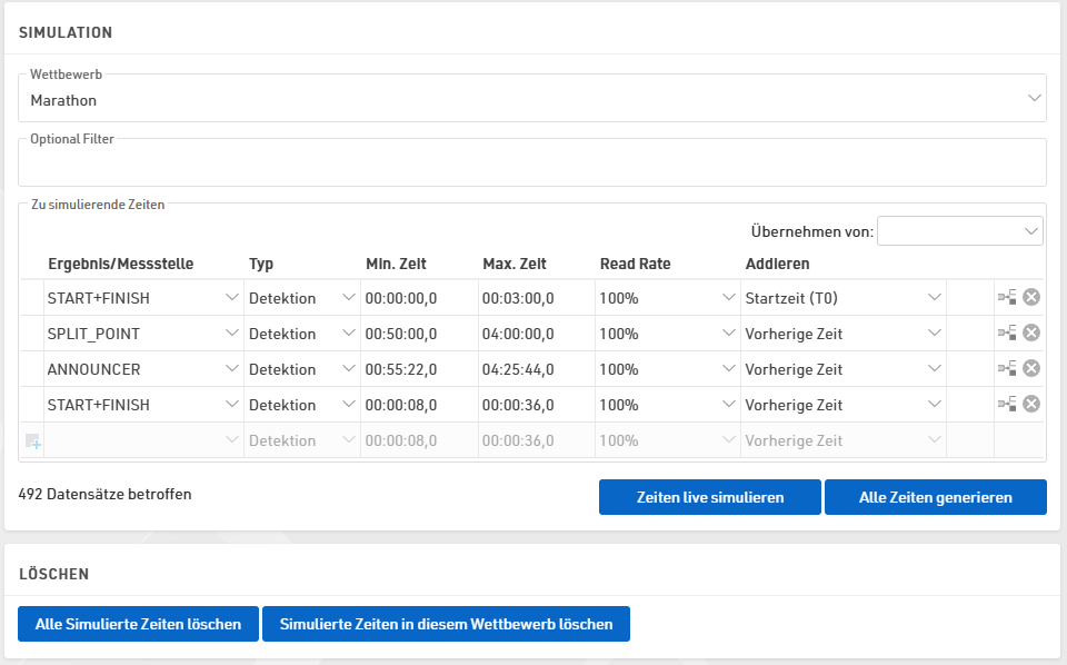 Die Race Simulation dient zur Simulation der Veranstaltung im Vorfeld, um sämtliche Einstellungen zu überprüfen. Sie können entweder alle Zeiten auf einmal generieren, oder die Zeiten live simulieren. Zweiteres ist nützlich, wenn Sie Funktionen wie das Moderator-Tool oder die Ergebnis-Anzeige testen möchten.