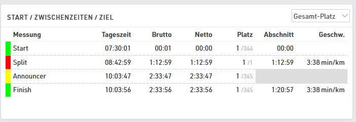Für jede Zwischenzeit werden sowohl die Tageszeit, die entsprechende Brutto- und Nettozeit, die oben ausgewählte Platzierung (Platzierung nach Brutto oder Netto, wie im Rennverlauf konfiguriert), die Abschnittszeit (seit vorheriger Zwischenzeit) und dazugehörige Geschwindigkeit/Pace angezeigt.