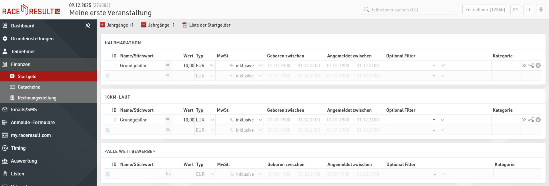 - Startgeld-Erhöhung um 2 EUR ab dem 19.07.2020: Definieren Sie wie oben ein Startgeld über 10 EUR mit Angabe „Angemeldet zwischen: 01.01.1900 – 18.07.2020“ und ein weiteres Startgeld über 12 EUR mit Angabe „Angemeldet zwischen: 19.07.2020 – 31.12.2100“. Achten Sie darauf, dass die Datumsbereiche sich nicht überschneiden und dass keine Lücke entsteht (sonst kann man sich z.B. einen Tag lang kostenlos anmelden).