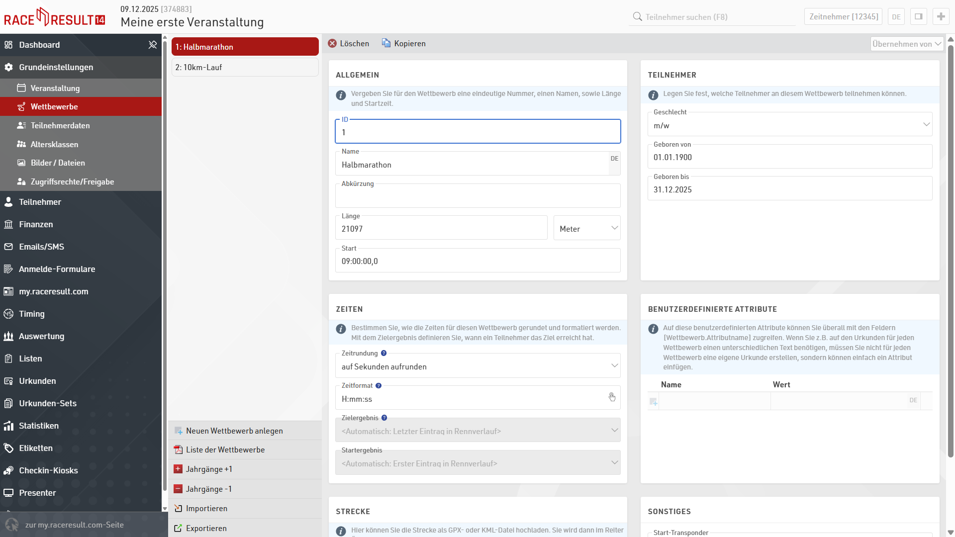 Klicken Sie anschließend auf Wettbewerbe, um die verschiedenen Wettbewerbe Ihrer Veranstaltung anzulegen. Die Wettbewerbe können z.B. sein: ein 5km-Lauf, ein 10km-Lauf und ein Halbmarathon. Zwei Wettbewerbe werden standardmäßig angelegt. Weitere können Sie durch Klick auf Neuen Wettbewerb anlegen erstellen. Sie können einen Wettbewerb löschen, indem Sie den Wettbewerb auswählen und dann Löschen klicken.