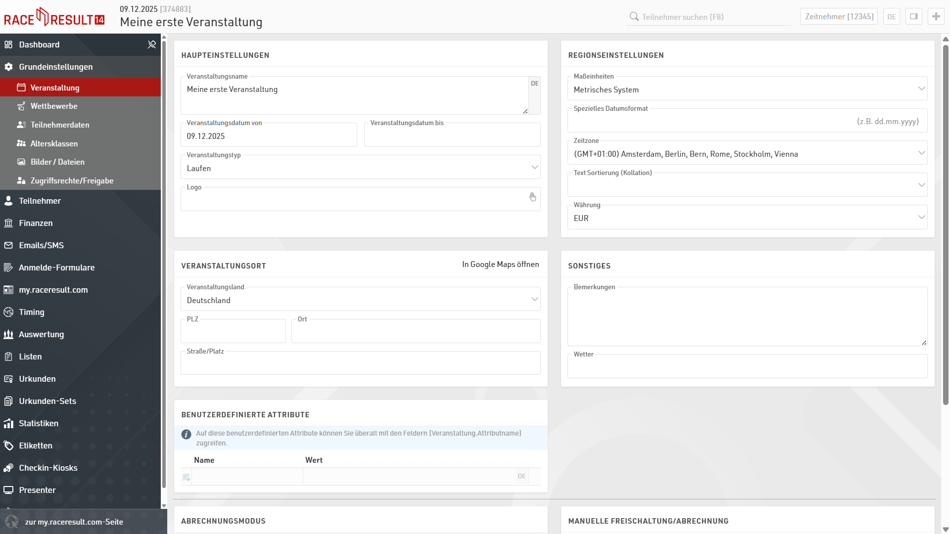Klicken Sie zunächst auf Grundeinstellungen, um allgemeine Einstellungen zur Veranstaltung zu setzen.