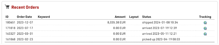 Your past orders with their status are displayed here, along with tracking links for orders.