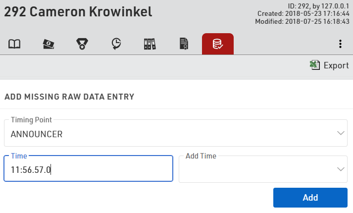 Additionally, times can be added manually in the Timing Raw Data tab of the Participant view. To do this, select the correct timing point and then enter the correct time to add to the participants raw data with "(Manual)" listed as the device.