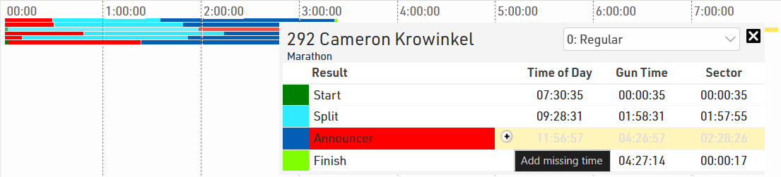 When viewing a participant with a missing time on the Time Visualisation, the missing time will be highlighted in red. You can quickly add predicted times by clicking the plus button and hitting enter after confirming the missing time.