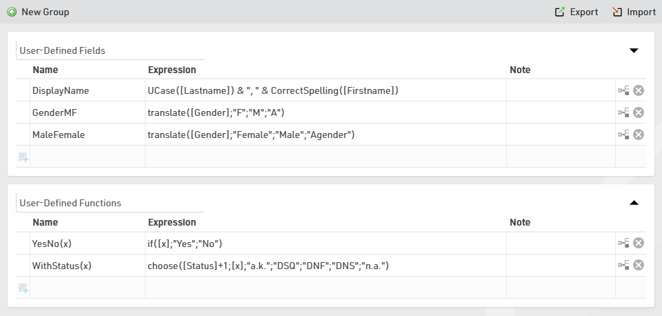 When creating User-Defined fields the Expression must be formatted as a RACE RESULT 14 Expression.
