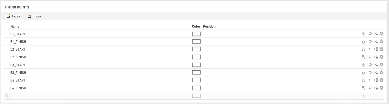 In this example, we are using three Timing Points, one for each timing location on the course, these are defined as STARTLINE, SPLITPOINT, and FINISHLINE.