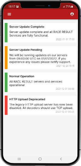 The free RACE RESULT Aurora app gives you remote access to your timing hardware. Use it to configure the decoder and track box, monitor the battery status and receive push notifications when there are important status changes in your devices. You can also access your RACE RESULT 12 event files via the app.