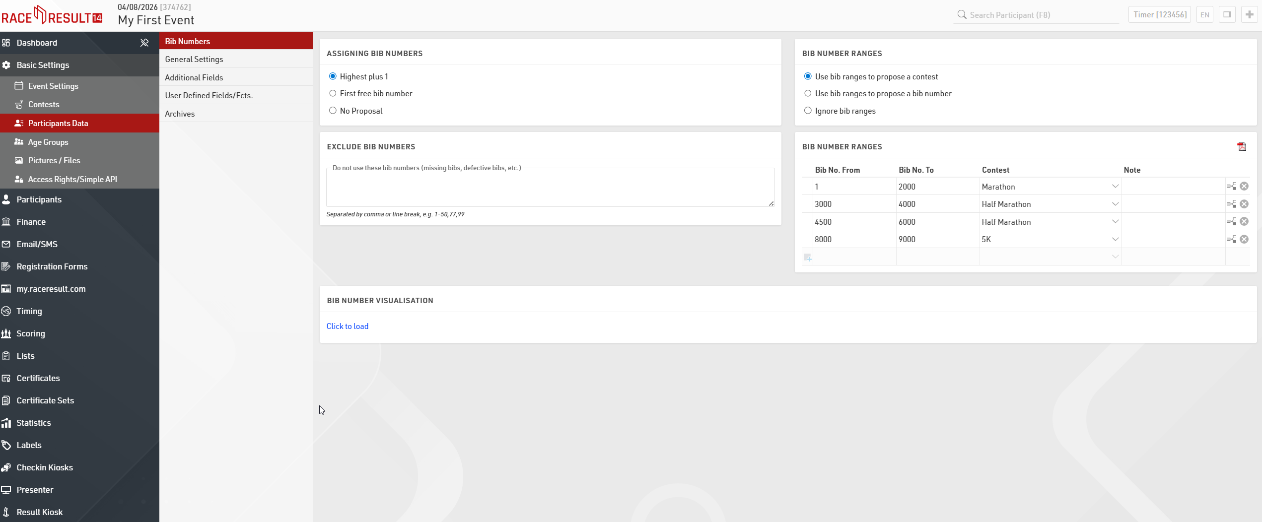 Defining bib ranges for each contest is optional, but having a clearer structure for your bib numbers can make adding participants much easier later on. You then have two options to deal with new entries based on bib ranges: Use bib ranges to propose a contest and Use bib ranges to propose a bib number. In the first case, the contest will be set automatically when entering the bib number for a new participant. This scenario is most suitable for late entries during the event. The latter case searches for an available bib number after choosing the contest the new participant will compete in. This option should be chosen during pre-registration before the event.