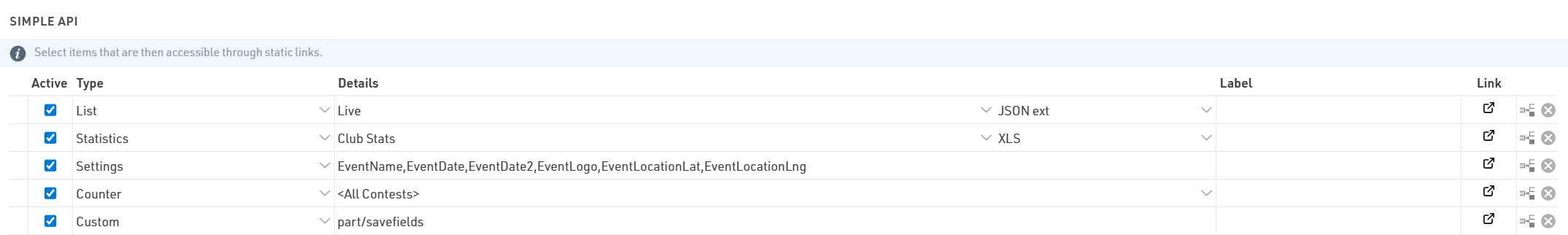 The Simple API serves to make data from your event file accessible through a static link without logging in to your customer account, this may be to publish results on another website.