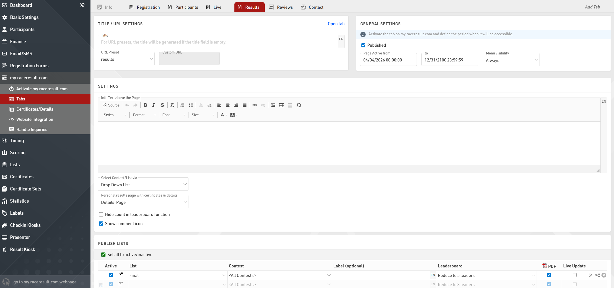 Generally the Participants page is used to publish a start list before the event, Live is used for a live leaderboard during the event and Results is used for official results during and after the event. Each page has a setting of how it shows up in the menu and a date range which defines when the page is available online, the default settings for each page are based on these general guidelines using the Event Date when the file is created.