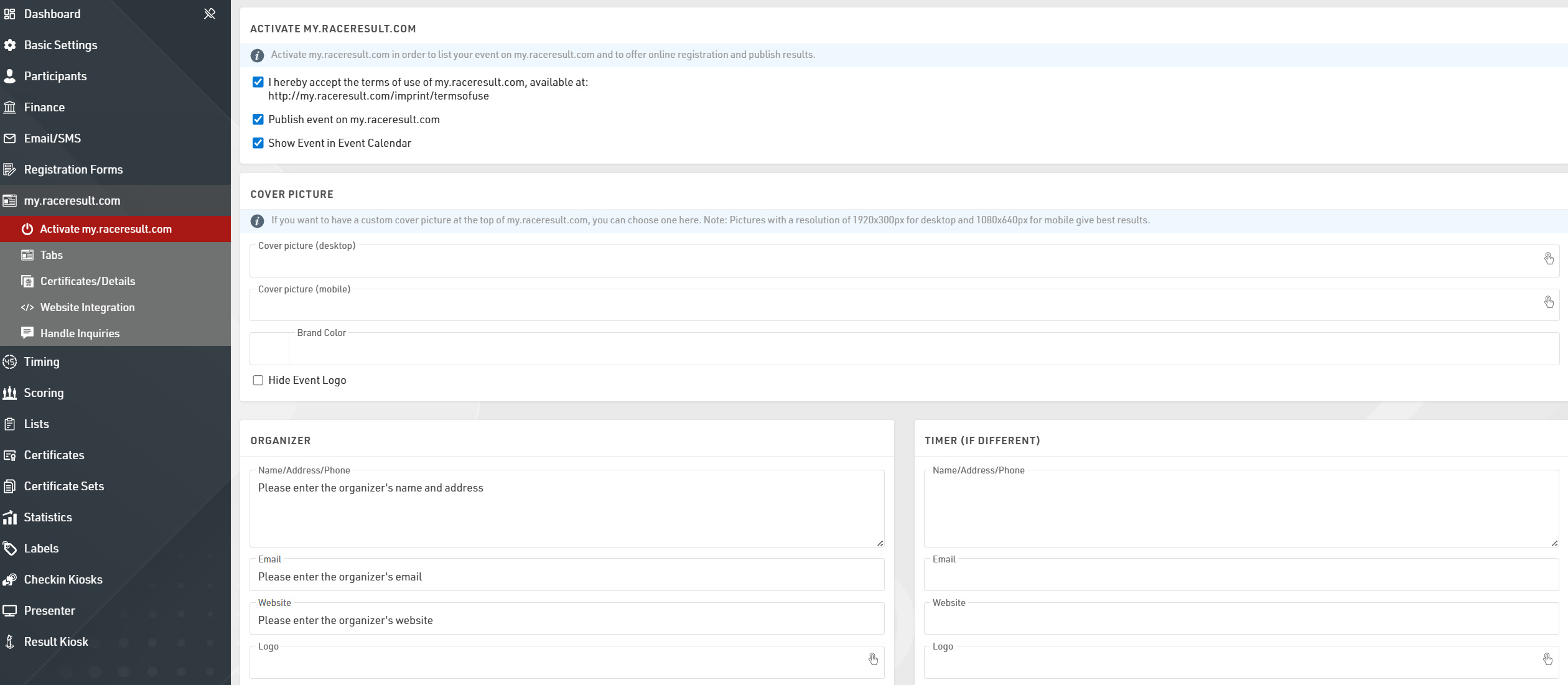 In order to publish your event online you first need to agree to the terms of use which are linked through the Avtivate my.raceresult.com page, you can then choose to publish the event and whether the event should be listed in the event calendar.