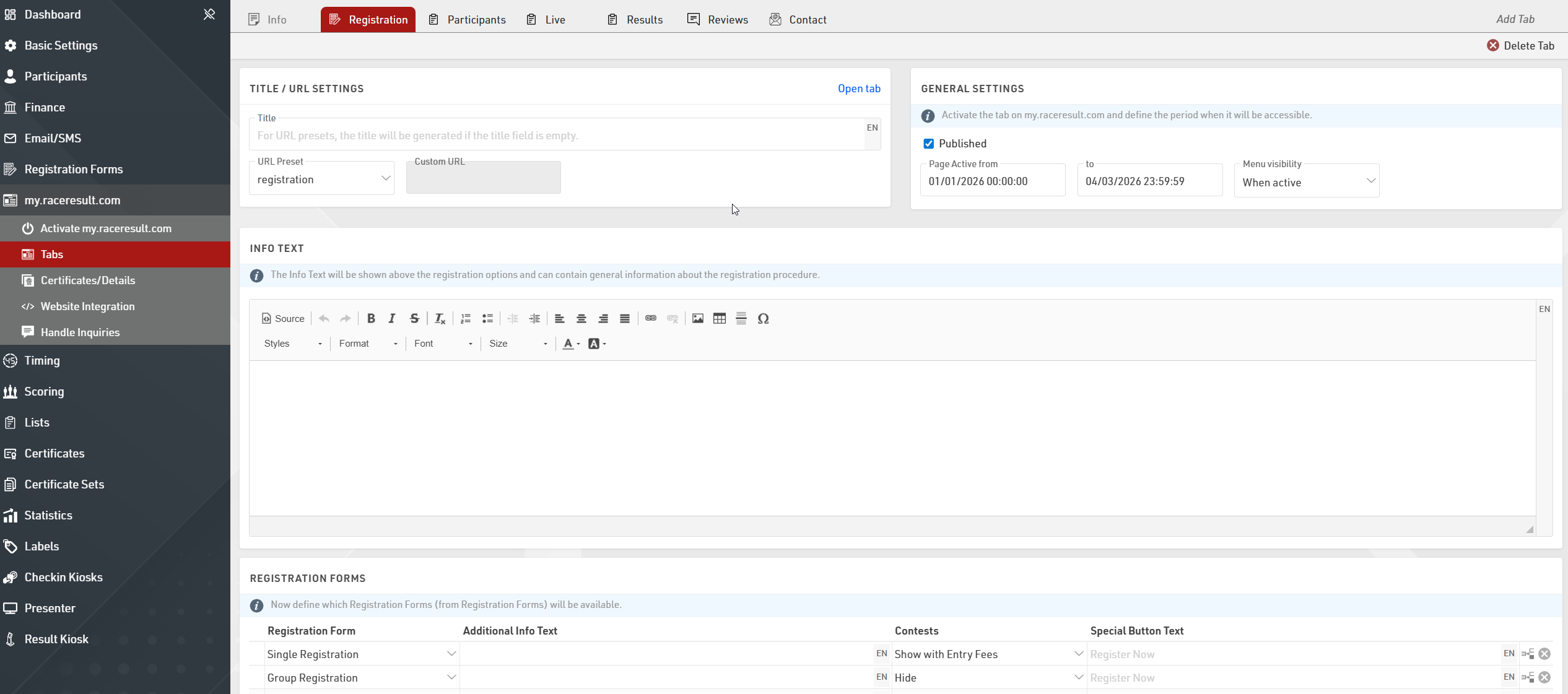 You will need to first setup the Registration Forms you wish to publish online, then you can activate a Registration tab and select the date range for which the Registration tab should be available.