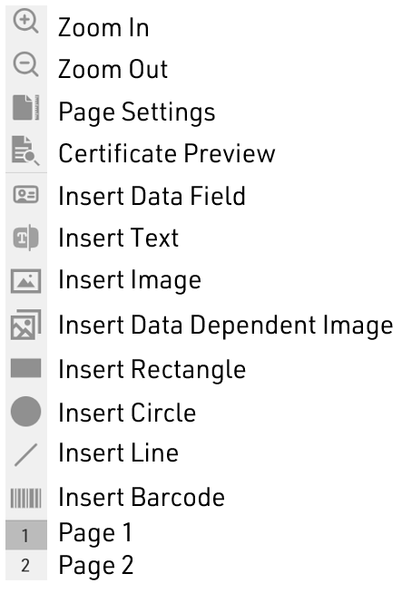 Optionally, a certificate can include more than one page. Simply click on "2" in the toolbar on the right to access page 2. Once you have placed an element there, you can add a page 3 and so on.