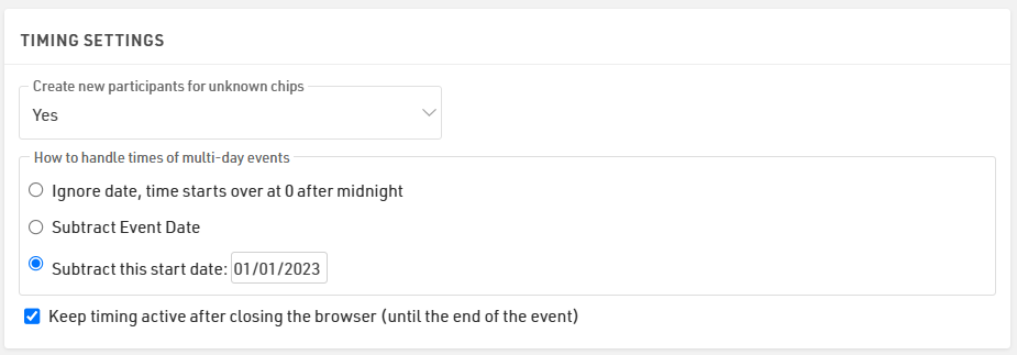 - The setting "Chip reads after Finish Time Limit" has been moved from "Timing Points" to "Start Times / Finish Time Limit"