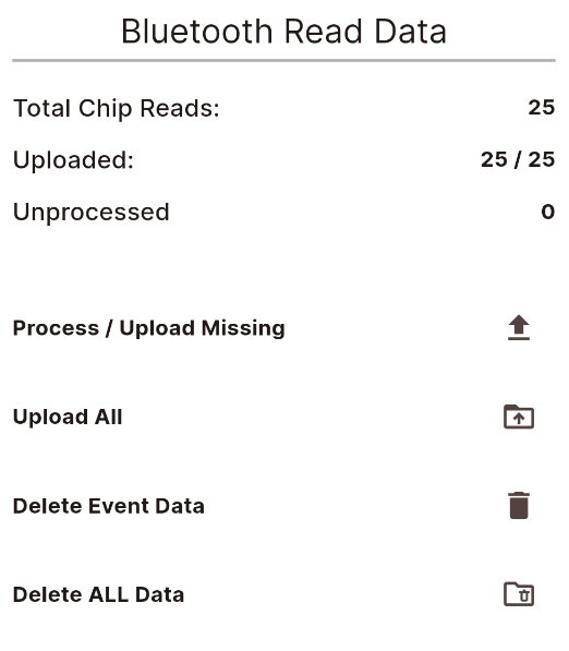 All chip reads are backed up to a local database on your device, in the event that internet connection is lost and not restored by the end of the event then these can be reprocessed and reuploaded from the settings page.