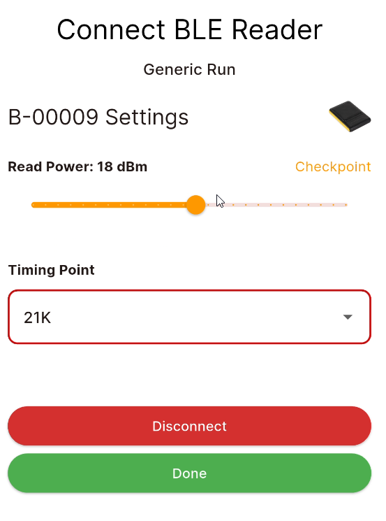 Once connected to the reader set the output power and select the Timing Point, and press Go to open the timing screen.