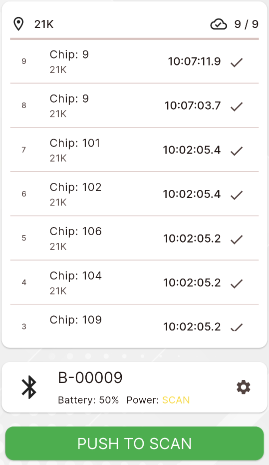 All chip reads recorded through the Checkpoint screen are stored on a local database on your device, times are stored as UNIX timestamps.