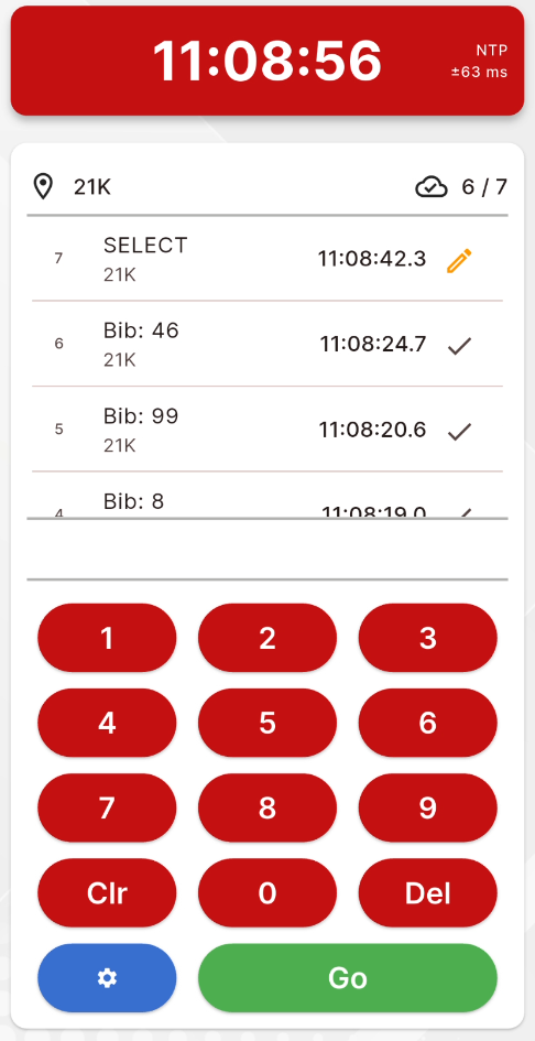 Hitting Go with no bib entered will create a SELECT record, this is useful if you have multiple times to record at the same time. These will not be uploaded until you click the edit button to set the bib number for the record.